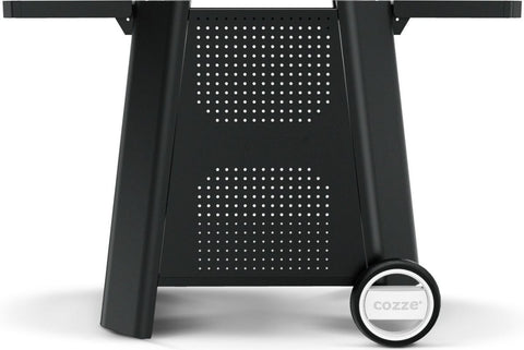 Ein schwarzer Cozze Gasgrill mit zwei Knöpfen, Metalldeckel, Seitenablagen, perforierter Front und Rädern passt zum Cozze Outdoor-Tisch für E-500 Elektrogrill, G-500 Gasgrill und Plancha. "Cozze"-Schriftzug auf Frontplatte und Rädern. Passt zu Pizzaofen Zubehör.