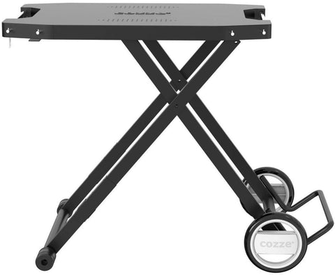 Der Cozze Klapptisch für den Außenbereich - schwarz ist ein schwarzer faltbarer Metallständer mit zwei großen Rädern und flacher Oberfläche, perfekt als Pizzaofen Zubehör. Für den Außenbereich konzipiert, erscheint das Cozze Markenlogo auf den Rädern und der Oberfläche.